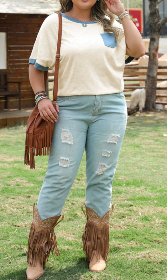 Regular price $17.99 USDRegular priceUnit price / perSale price $17.99 USDIvory Top with Blue Pocket and Trim