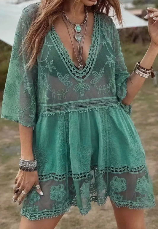 Lace Embroidered Crochet Cover Up Dress Shirt
