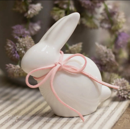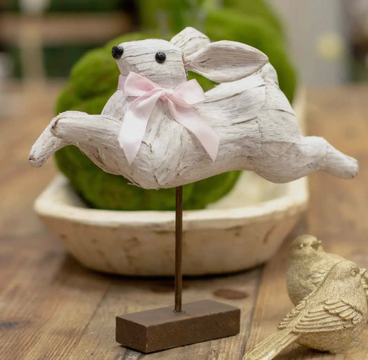 White Antique Style Leaping Bunny Rabbit with Pink Ribbon and Stand