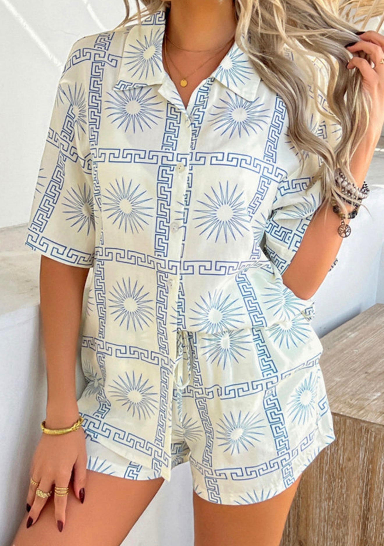 2 pc Cream Short Set with Blue Sun Design