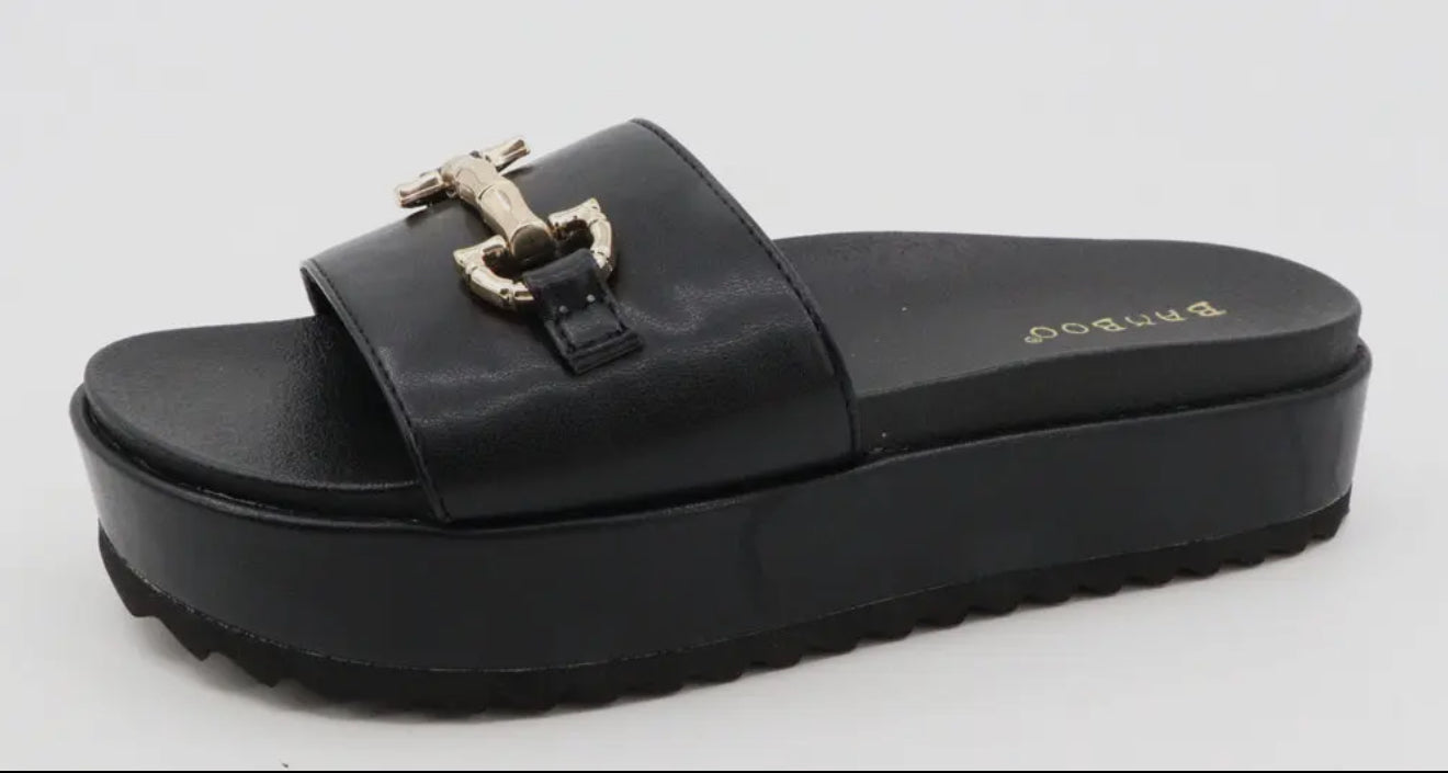 Classic slip on platform sandal with metal accent piece. Super comfortable to wear! It will be your go to shoe!