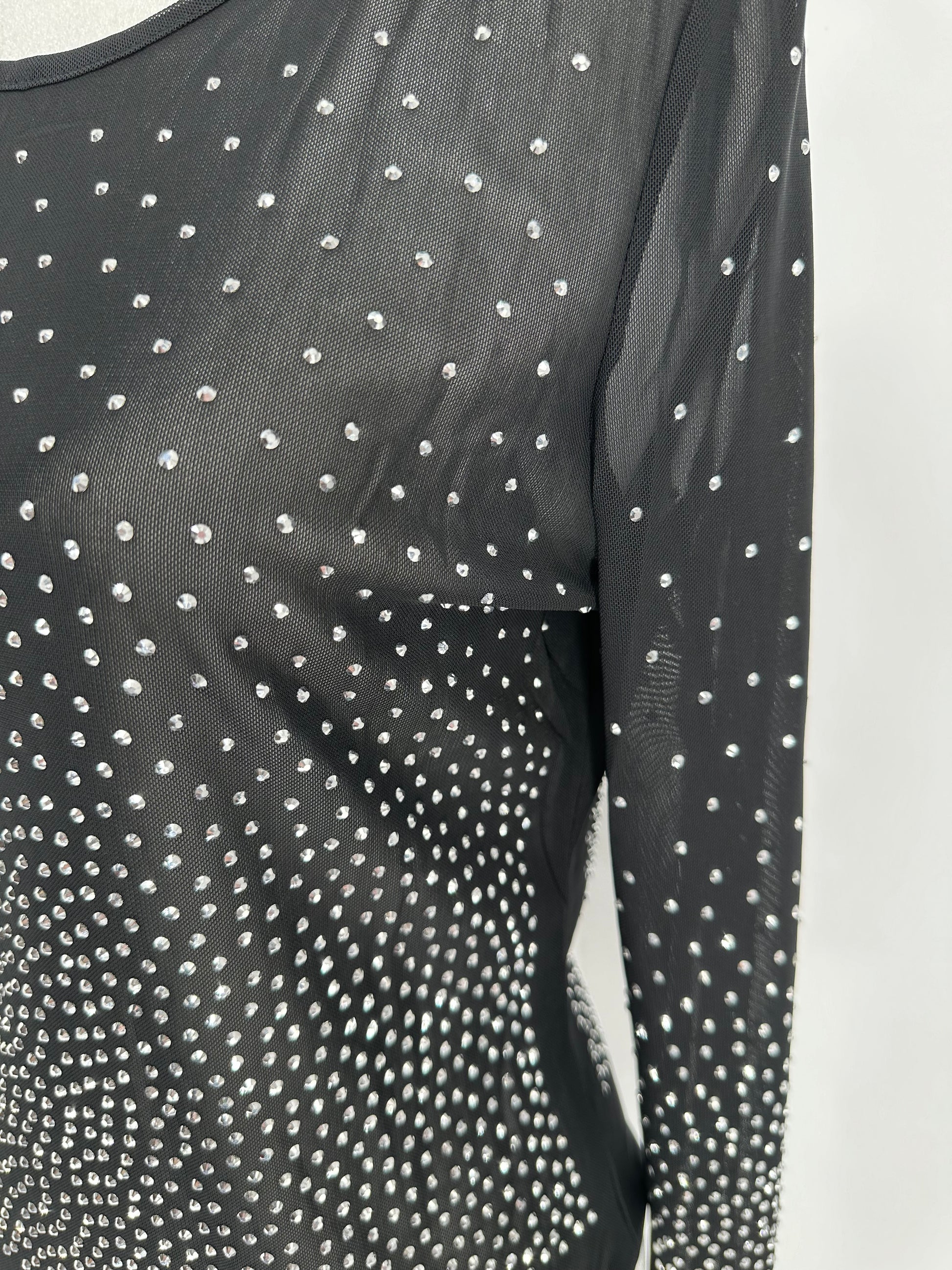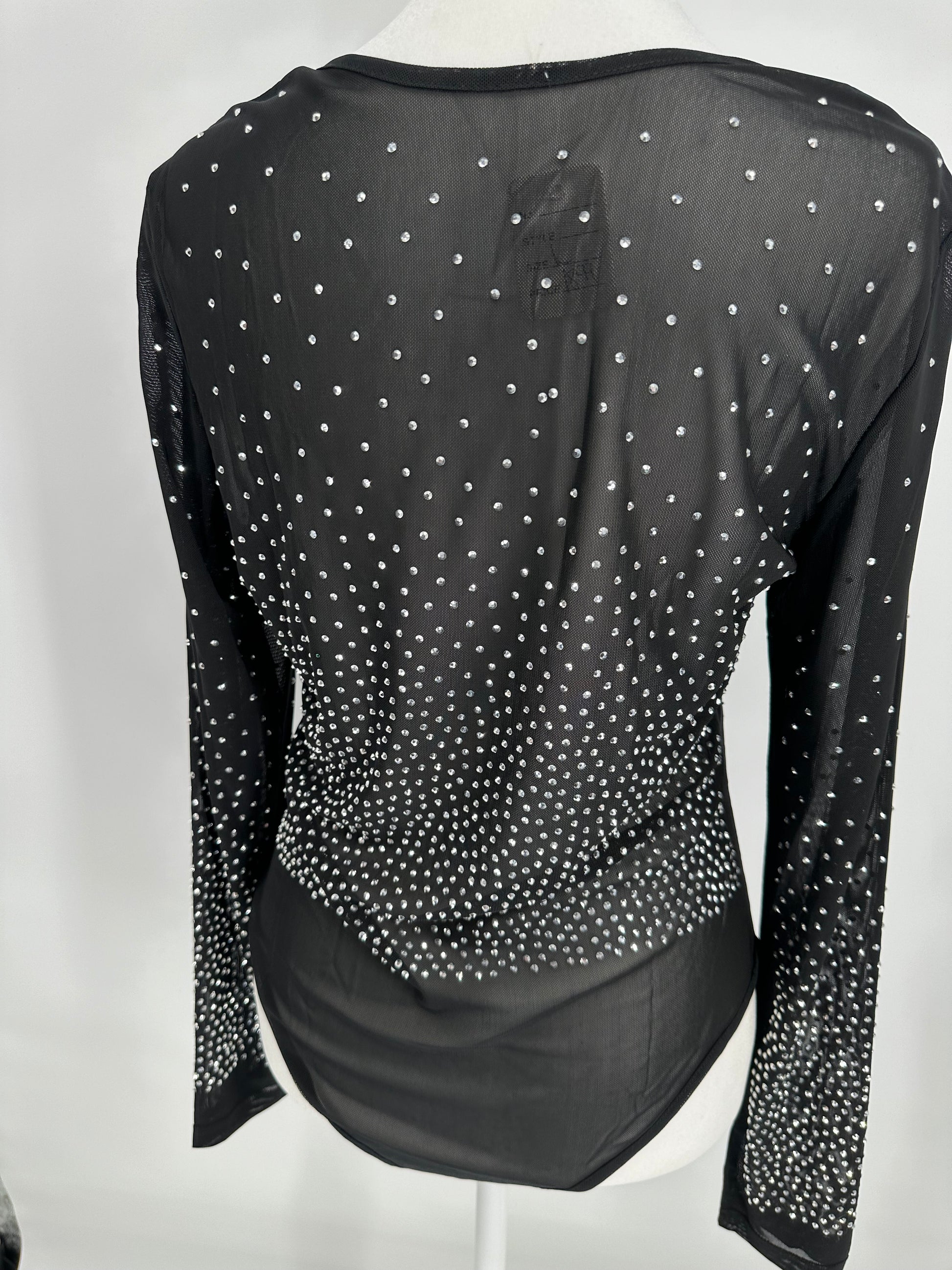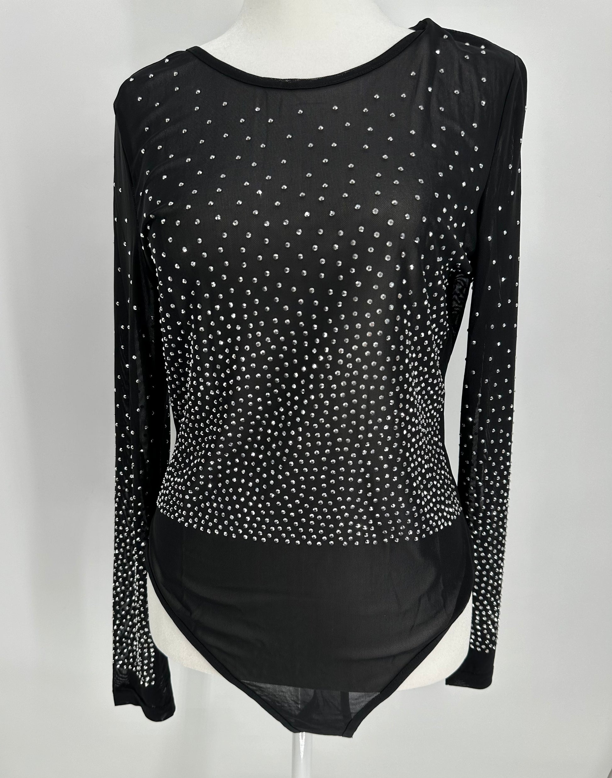 Sheer body suit covered with a lot of sparkle! Be the envy of the crowd in this attention getting top!