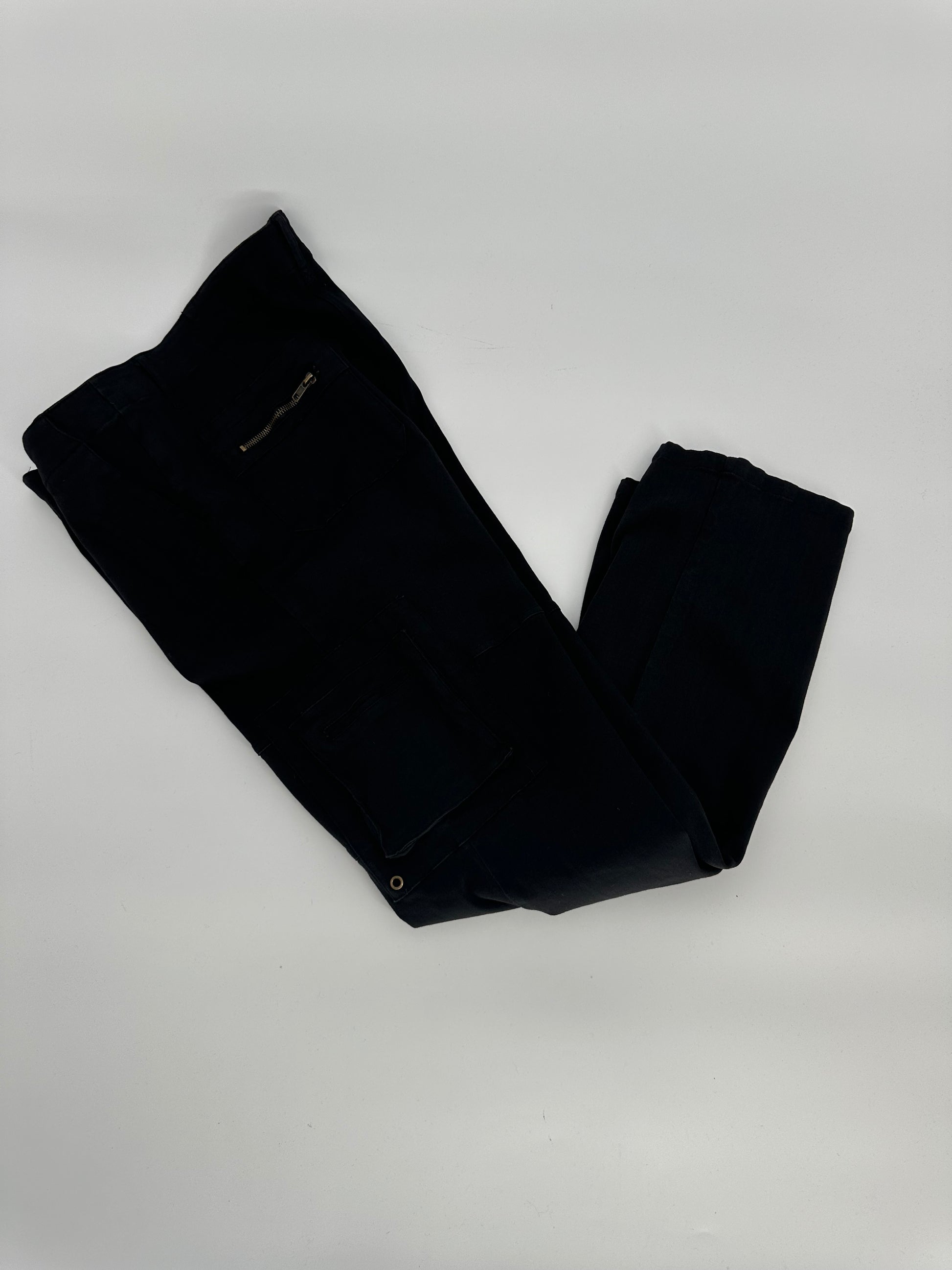 Black semi-stretch cargo pants with zip back pockets. Denim “weight” fabric, slightly brushed feel.