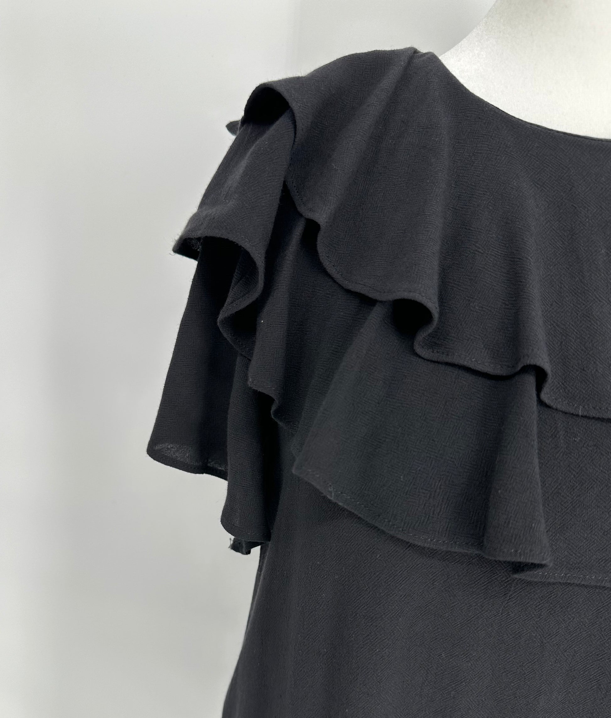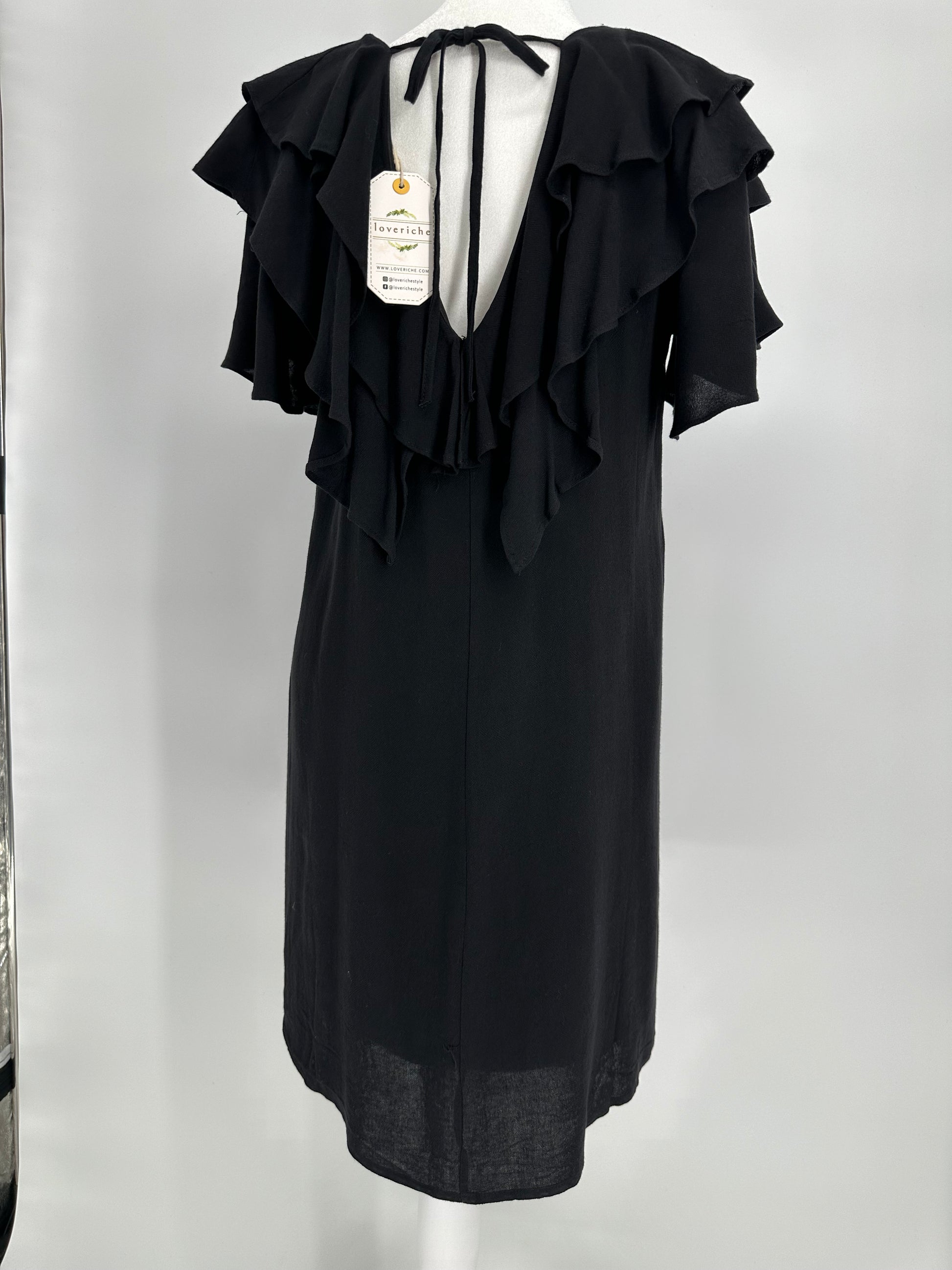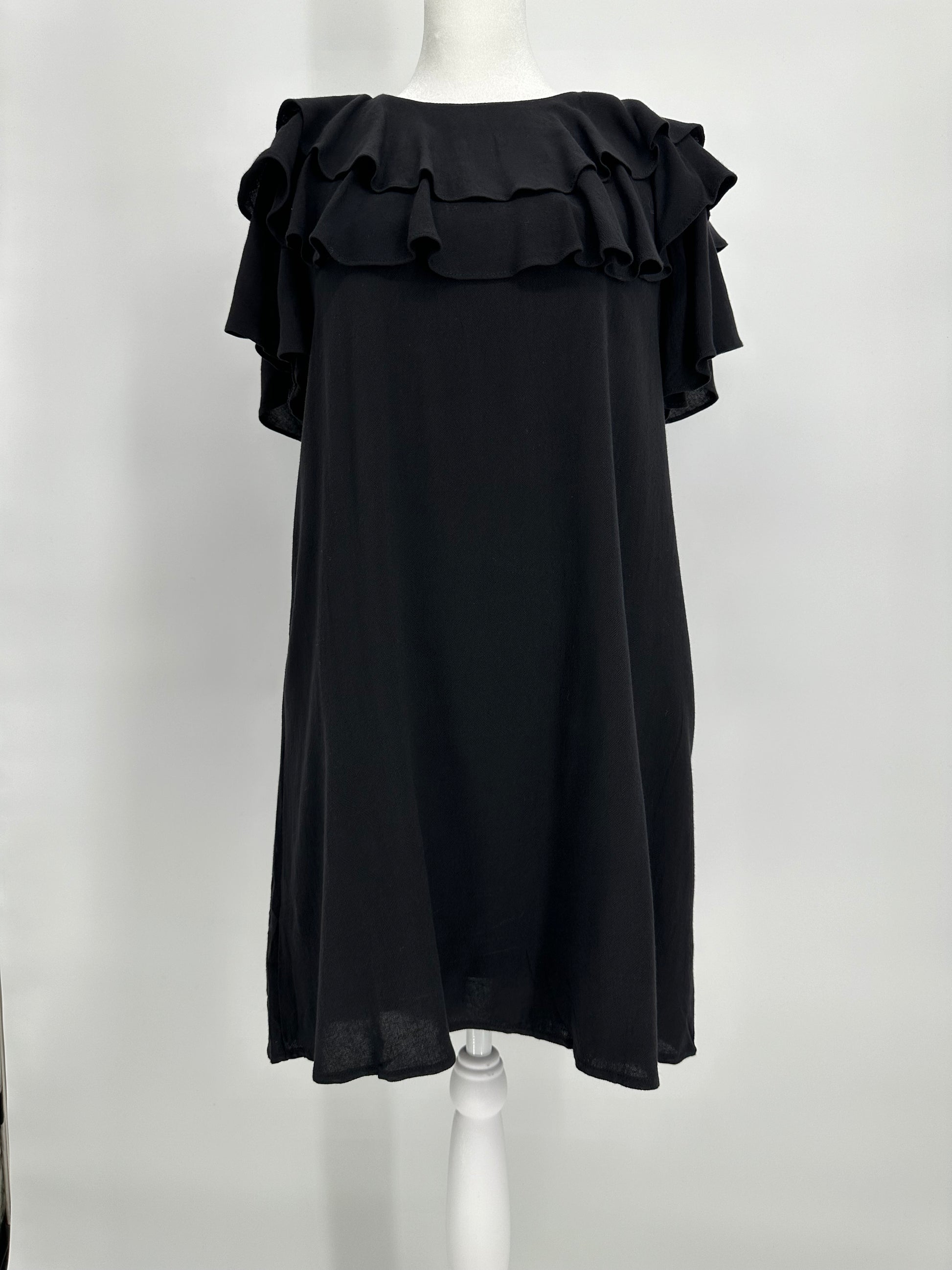 Black fully lined dress with Ruffle details and a dainty tie at the neck. Perfect little black dress for many occasions!