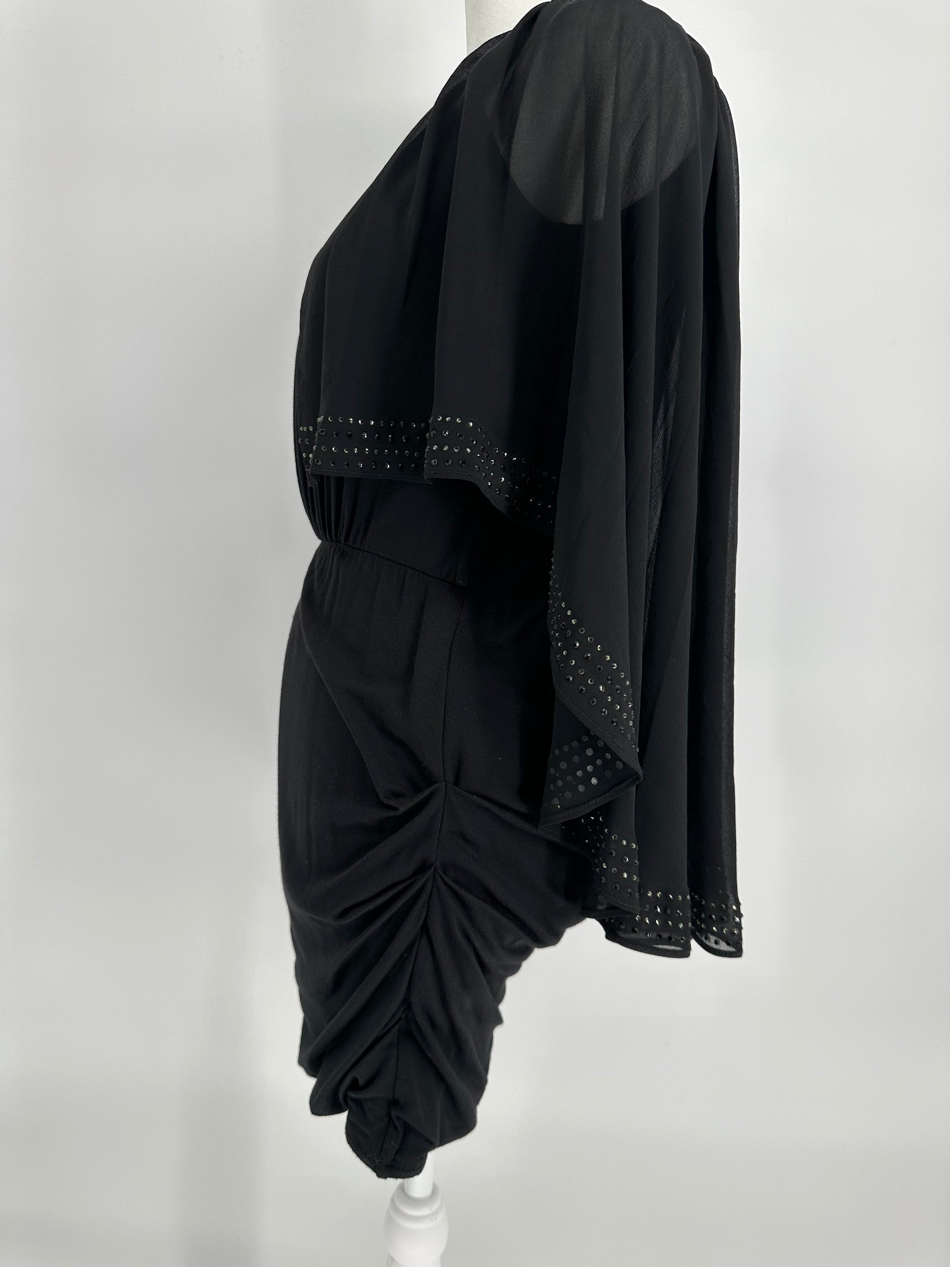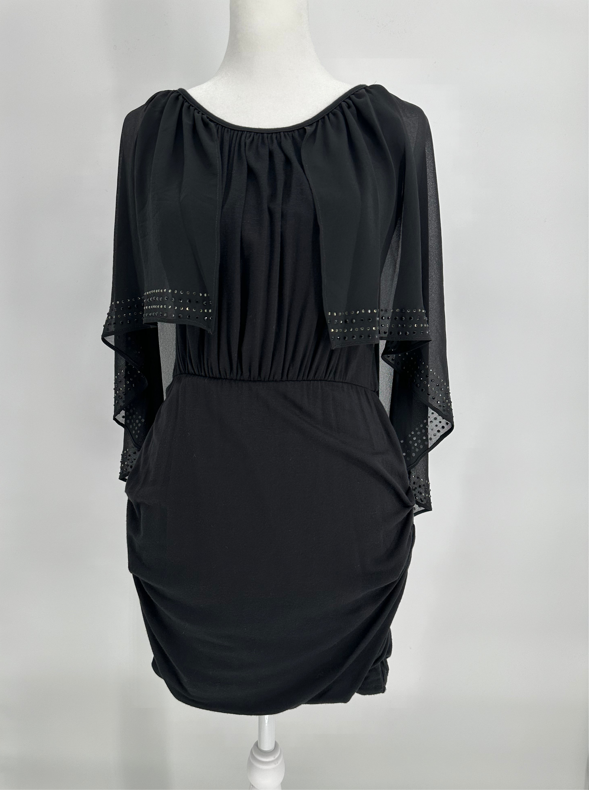 Lined black knit dress with sheer cape overlay and rocuhed sides.