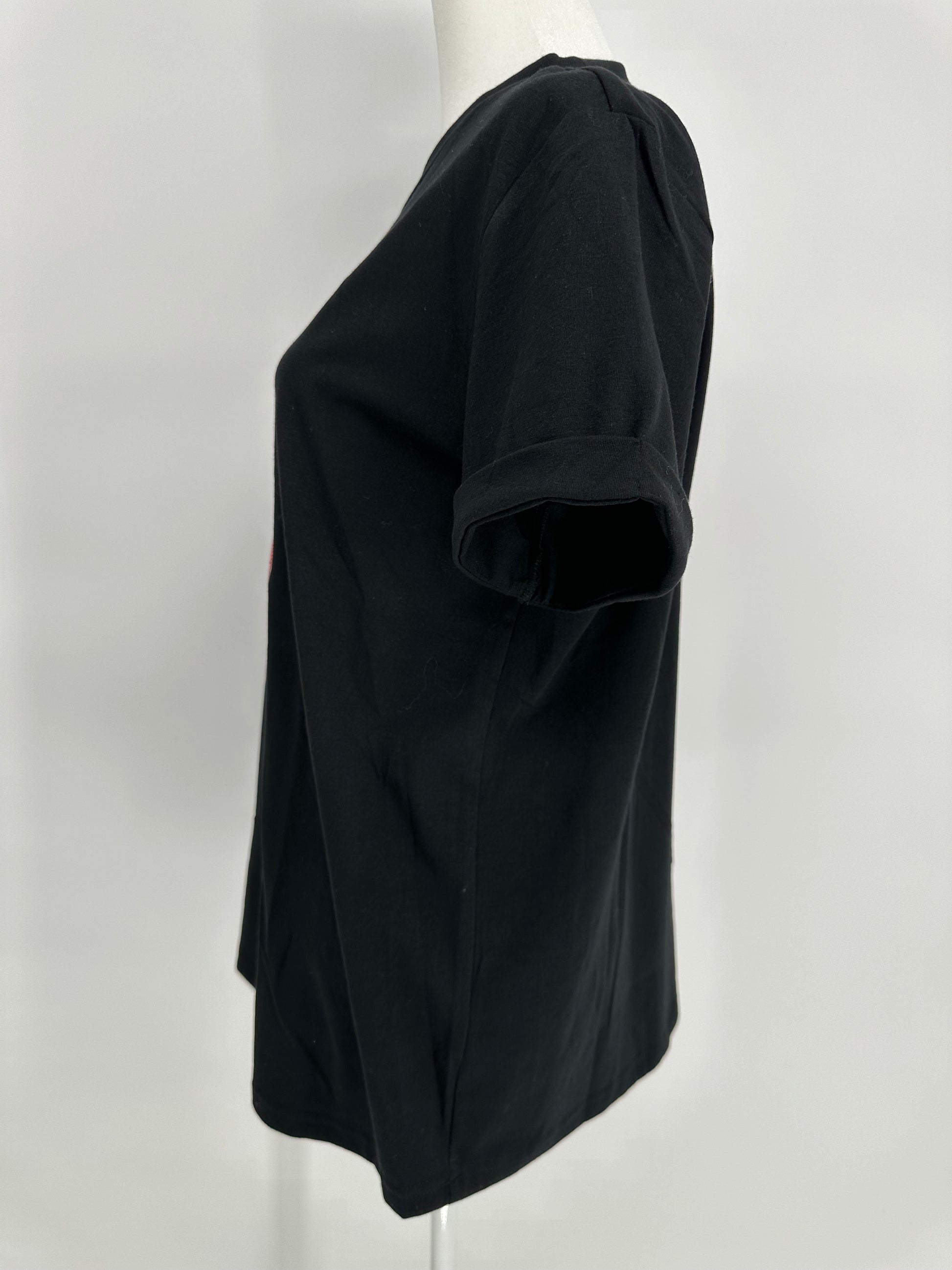 Rolled cuff short sleeved top with pink sequin bow detail. Generous sizing.