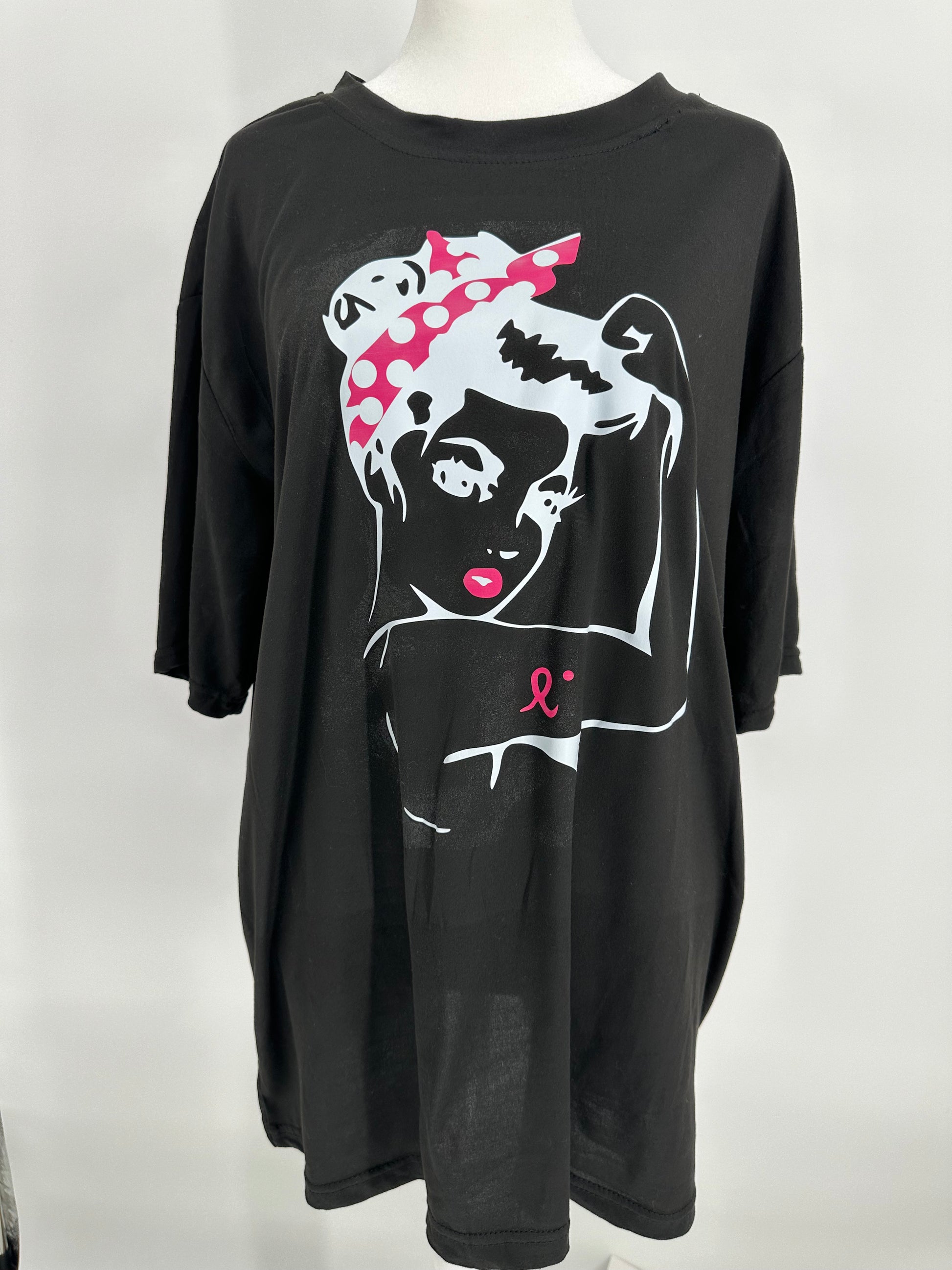 Black T-shirt with iconic strong Lady with pink breast cancer awareness ribbon tattoo.