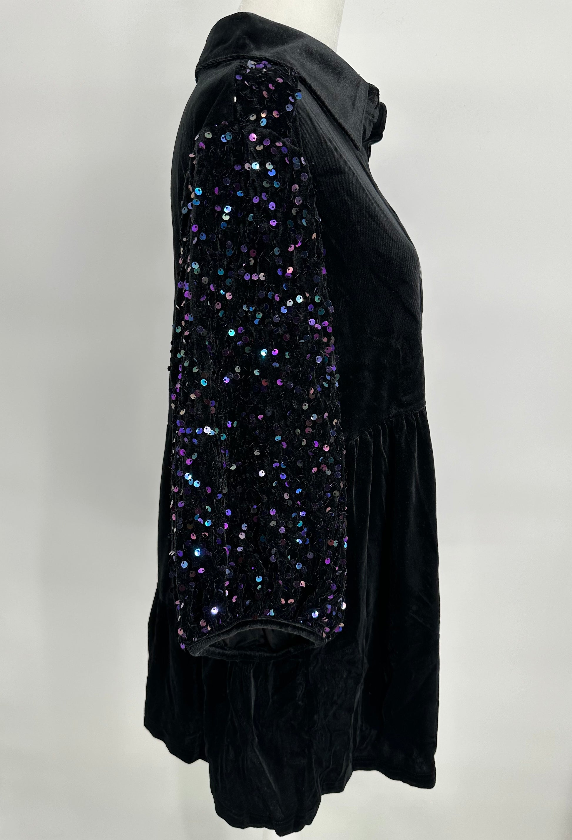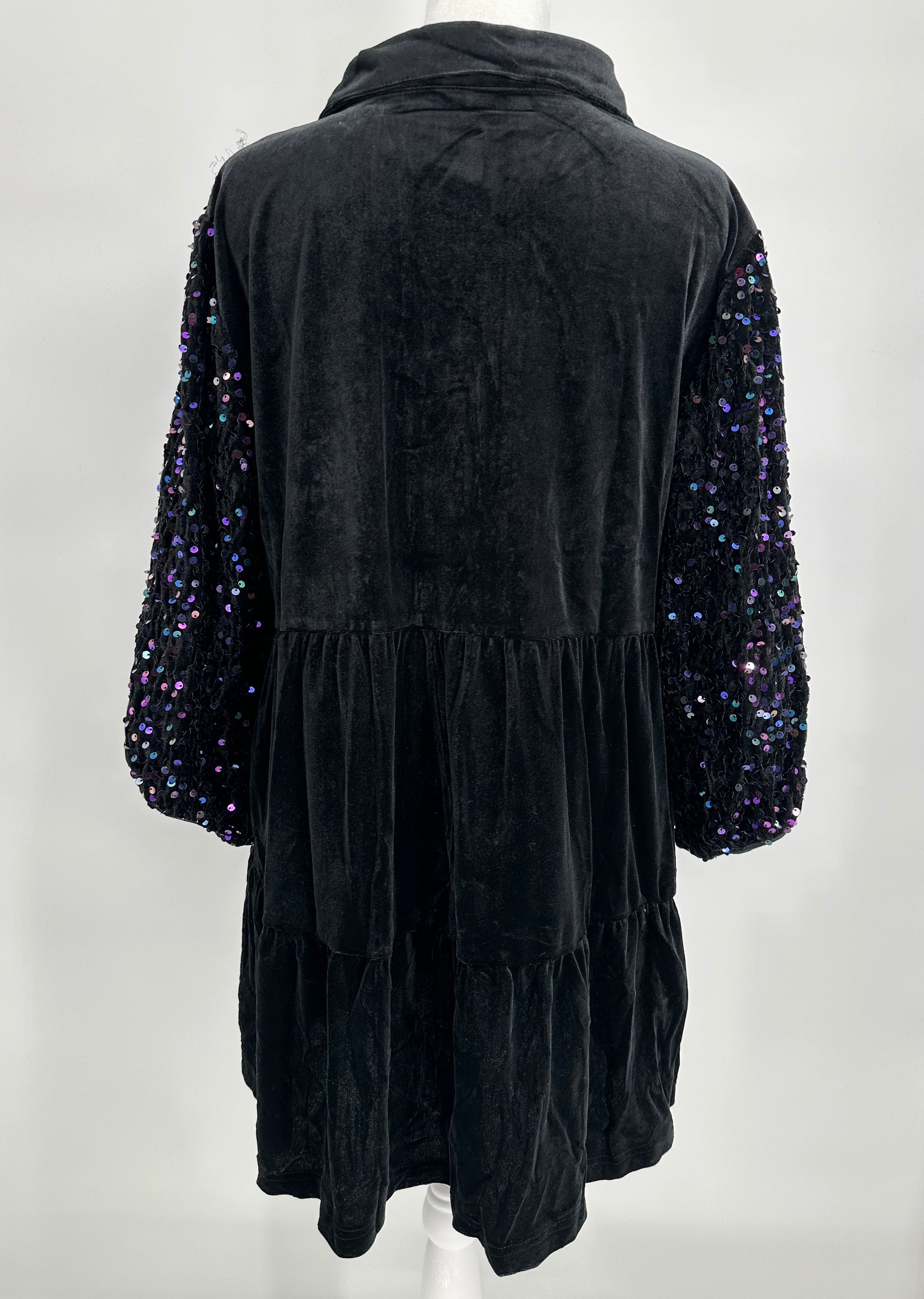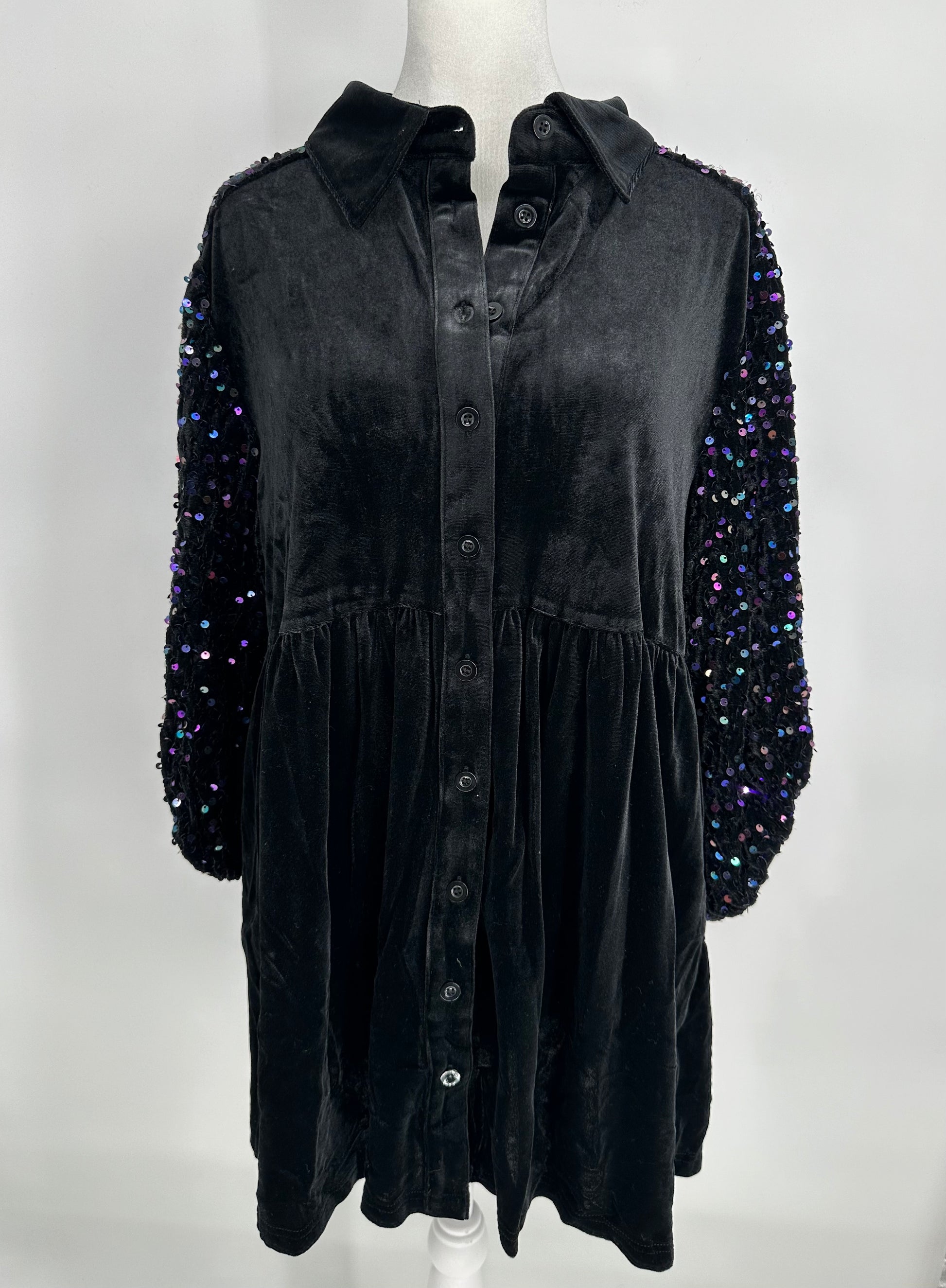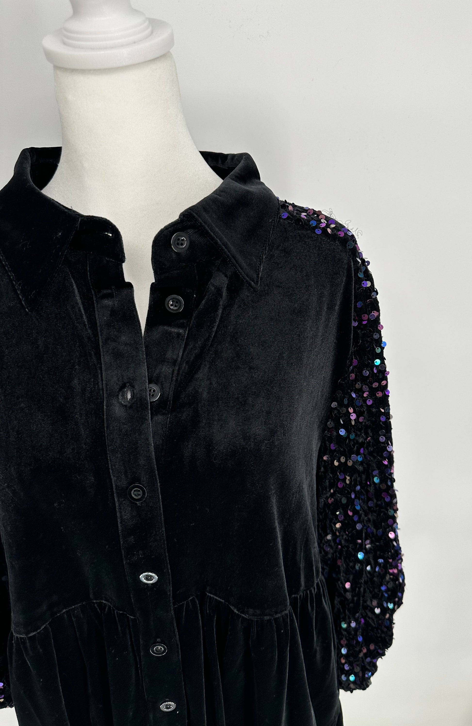 Black Velvet Button Front Dress with Sequin Sleeves