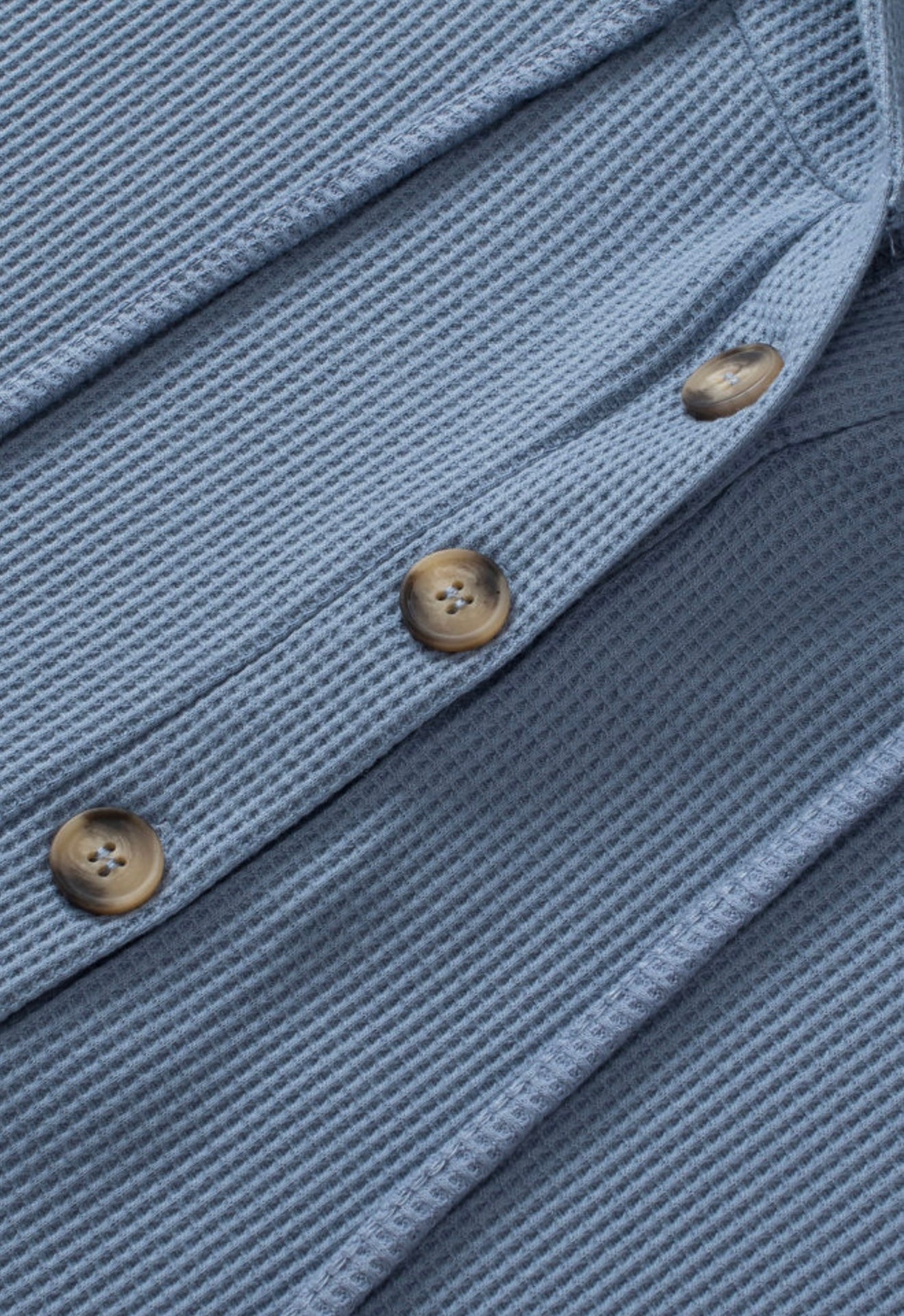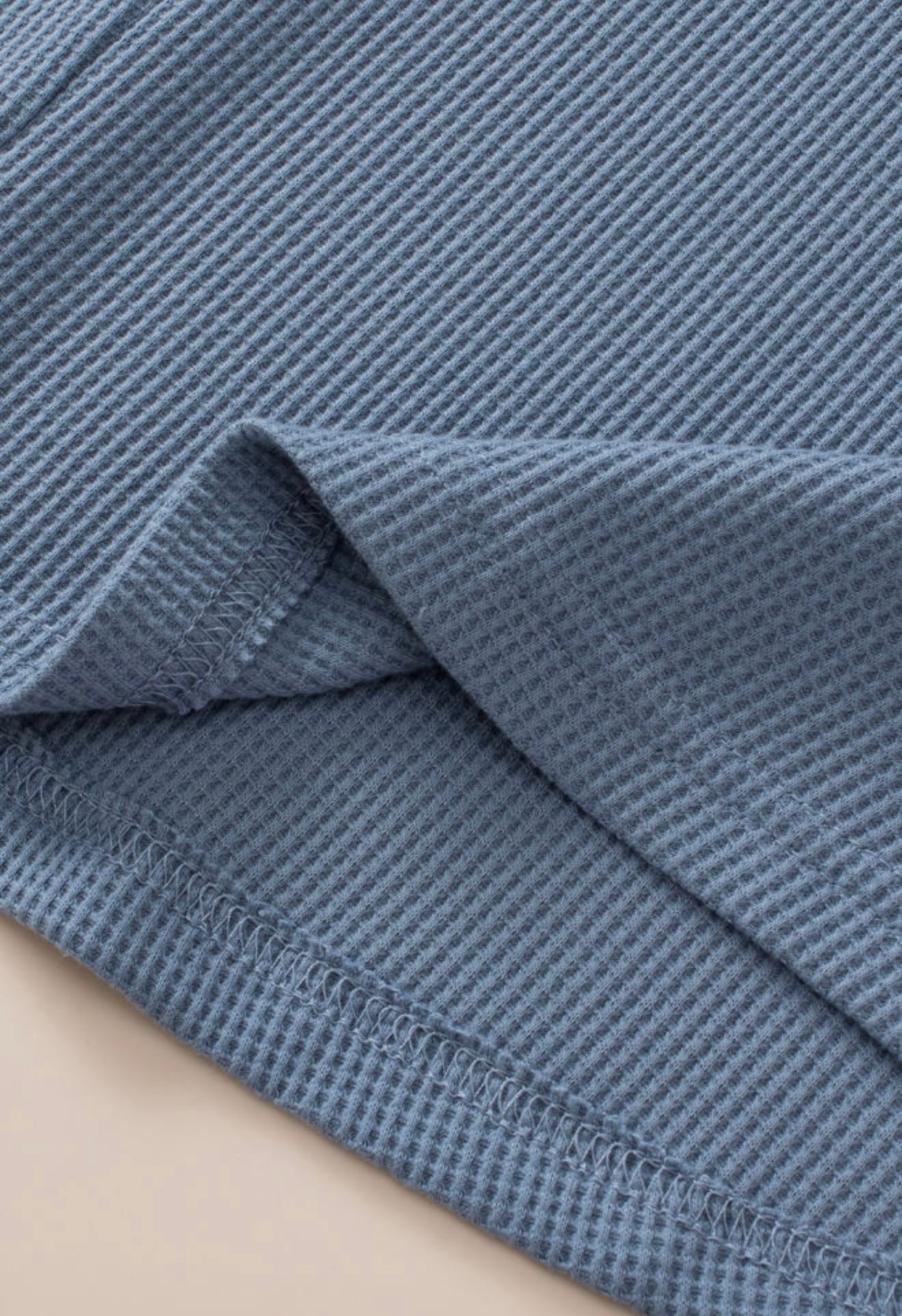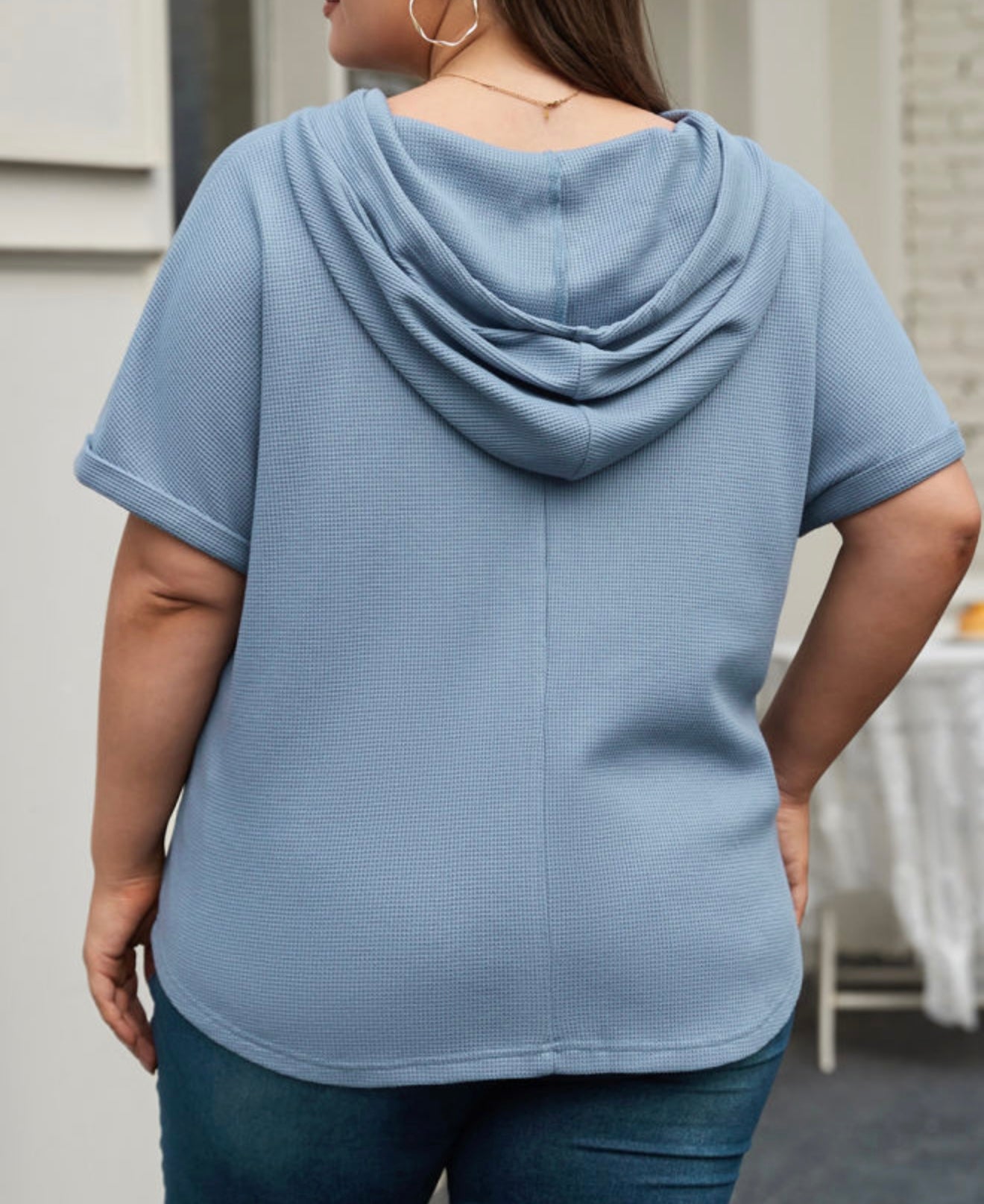 Stay comfortable and stylish in this blue short-sleeved top featuring charming wooden buttons and a cozy hood. Perfect for casual outings, its breathable fabric keeps you cool while adding a unique touch with natural wooden accents. Easy to pair with your favorite jeans or shorts for a relaxed, friendly look.