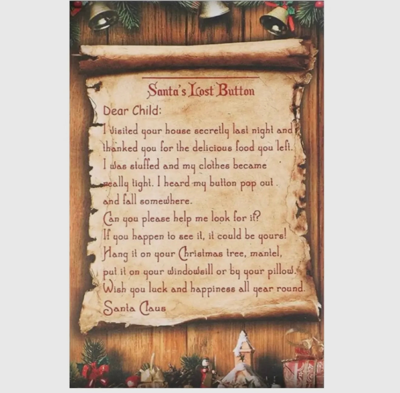 Santa ate so many cookies that he popped his button and couldn’t find it! Let your child find it, and hang it in your tree for Santa to get next year!