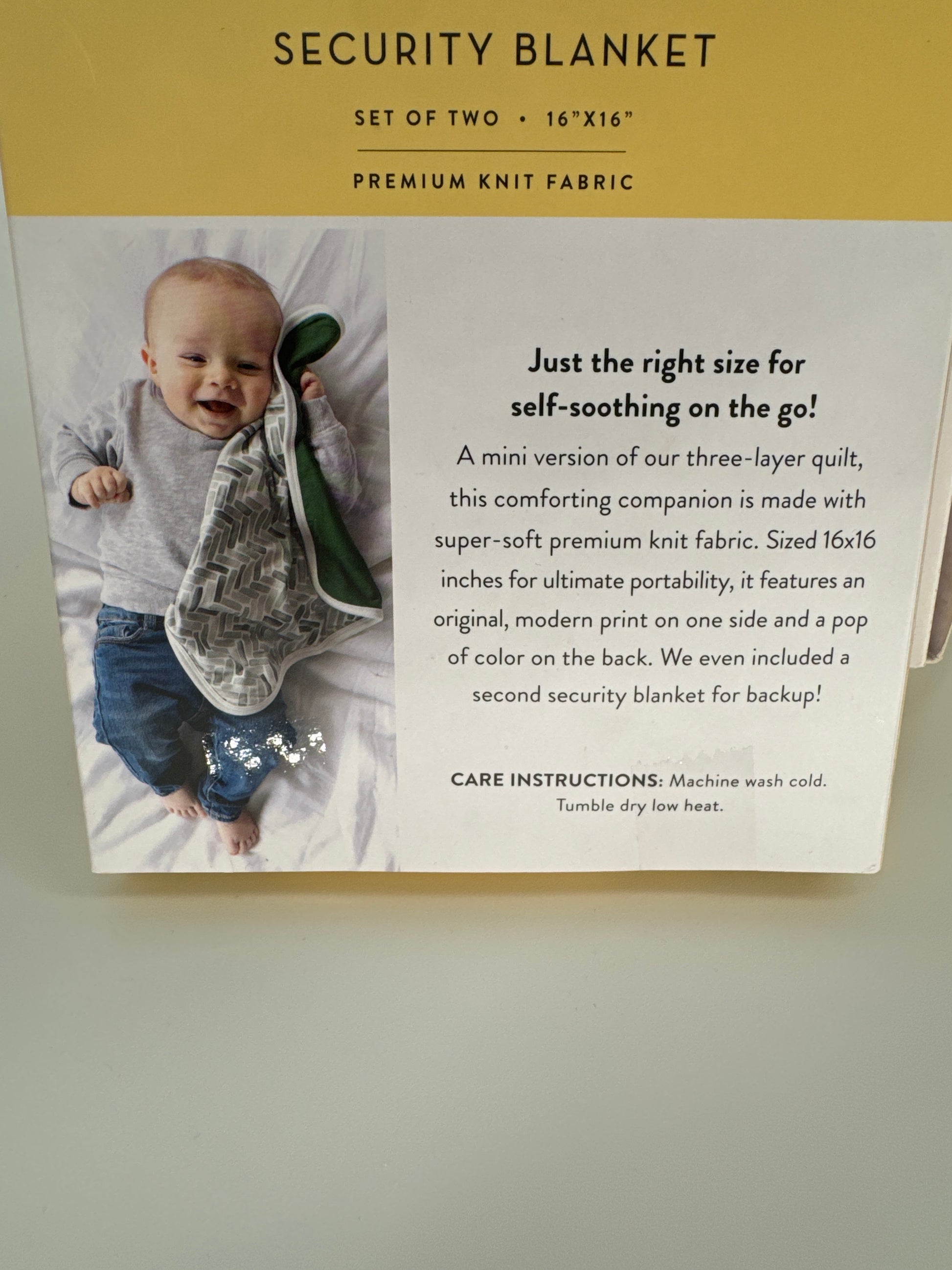 A mini version of our three-layer quilt, this comforting companion is made with super-soft premium knit fabric. Sized 16x16 inches for ultimate portability, it features an original, modern print on one side and a pop of color on the back. We even included a second security blanket for backup!