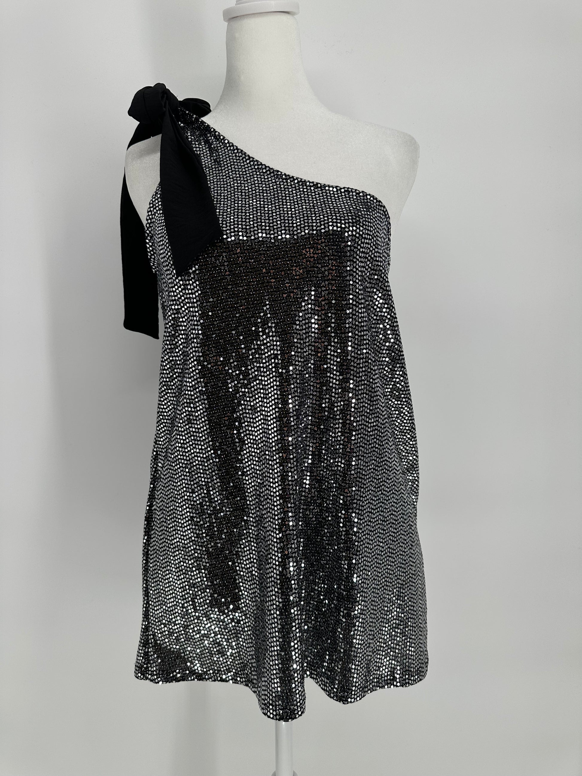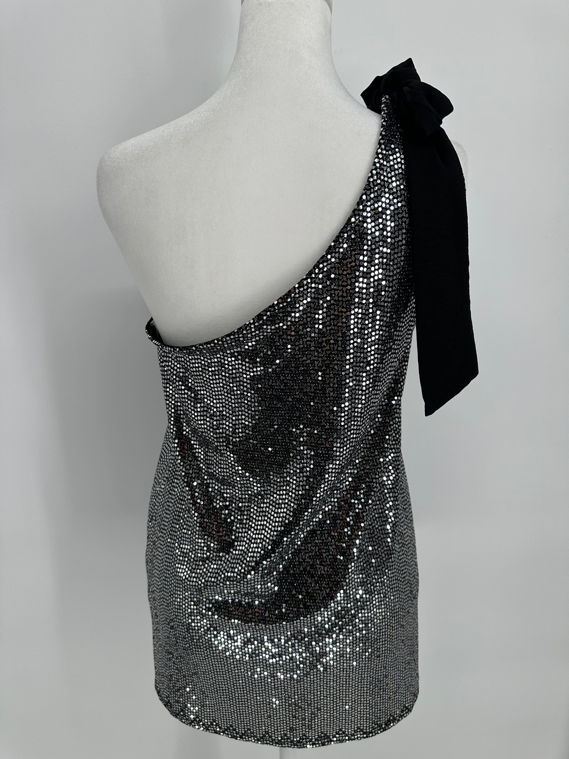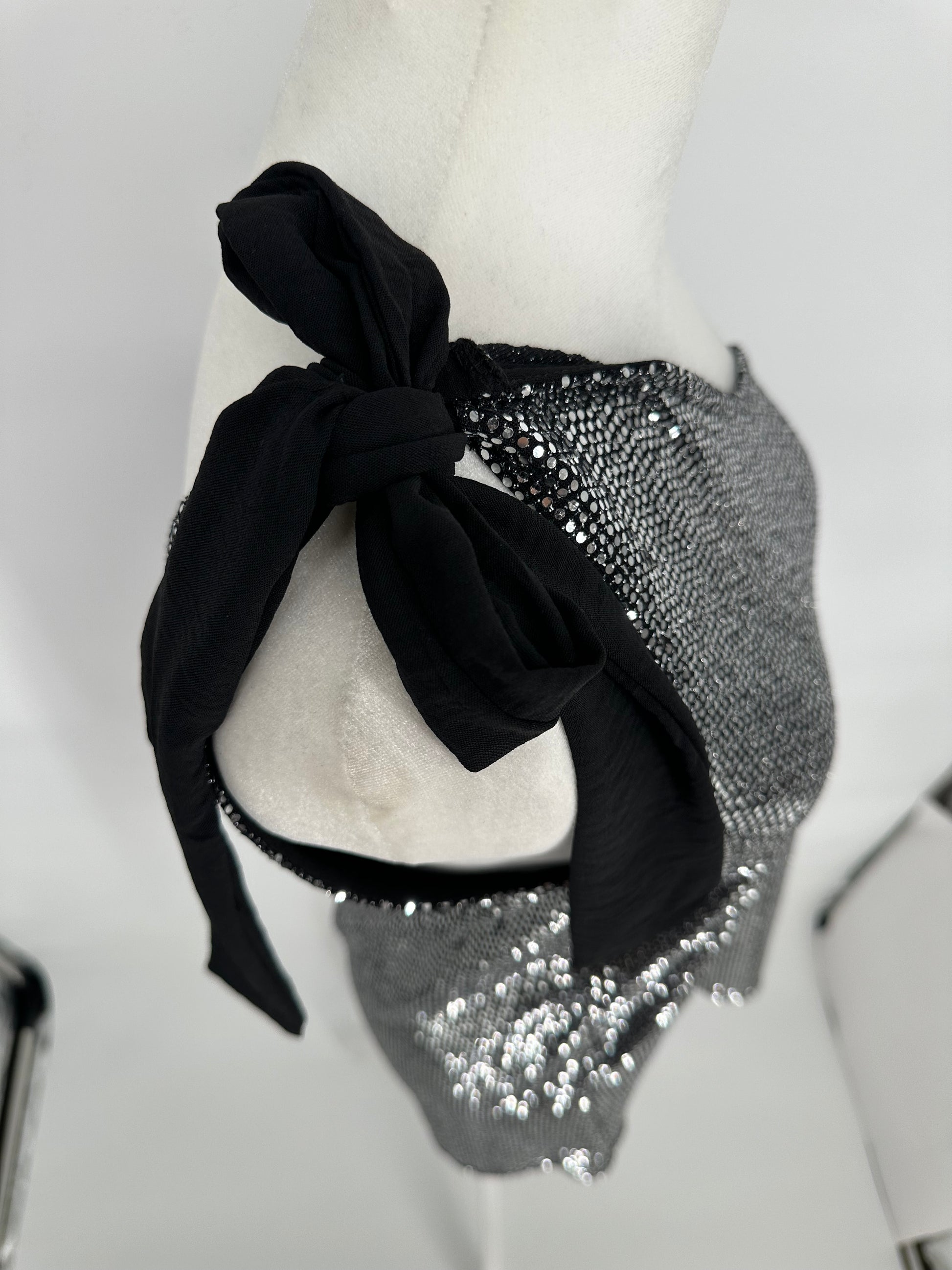 Black top with Silver Shimmer Sequins and One Shoulder Tie