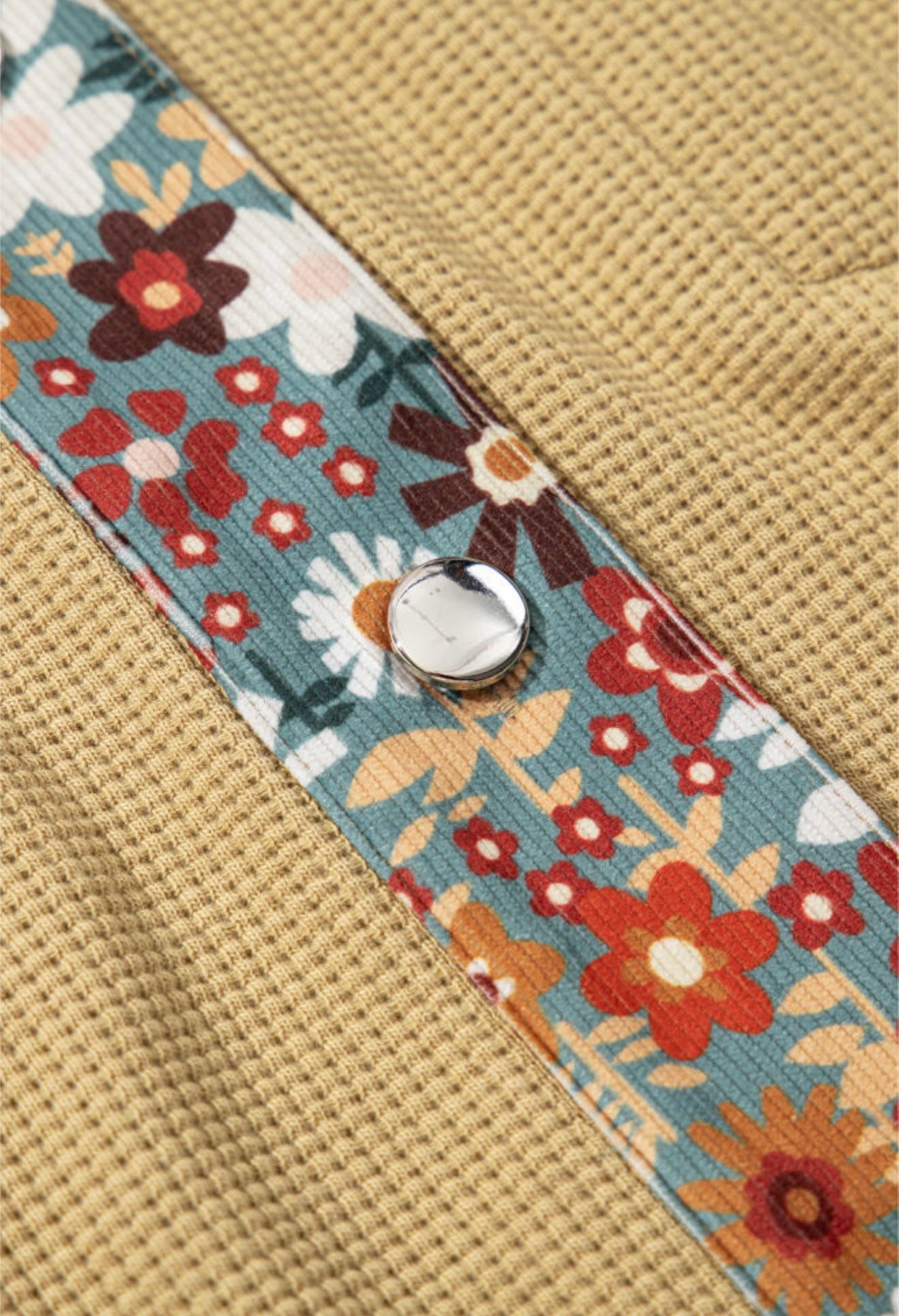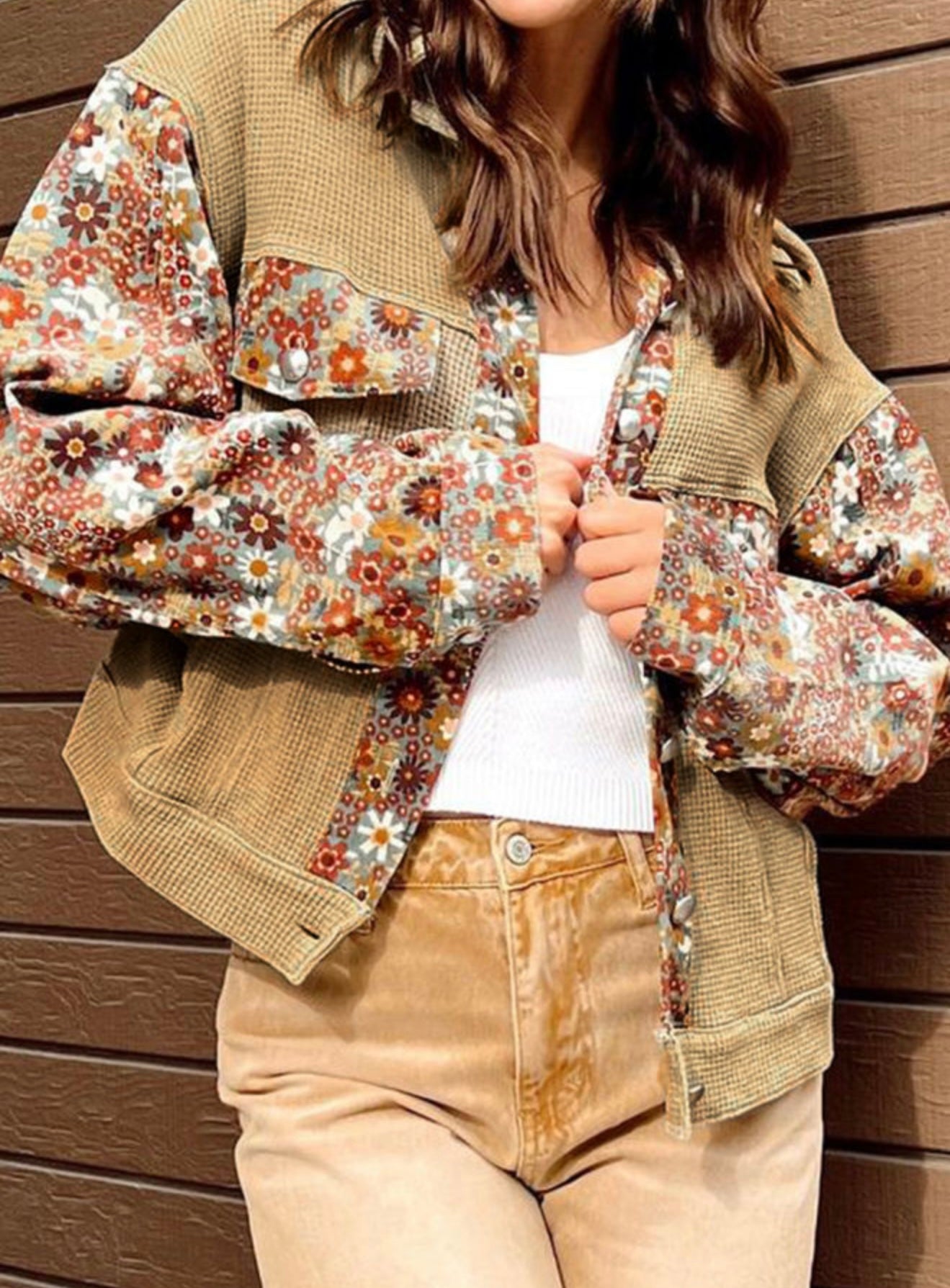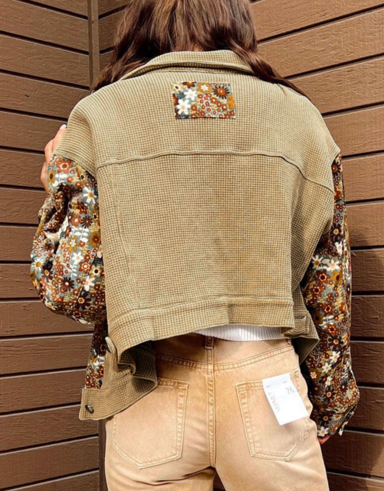 Tan waffle weave jacket with floral sleeves