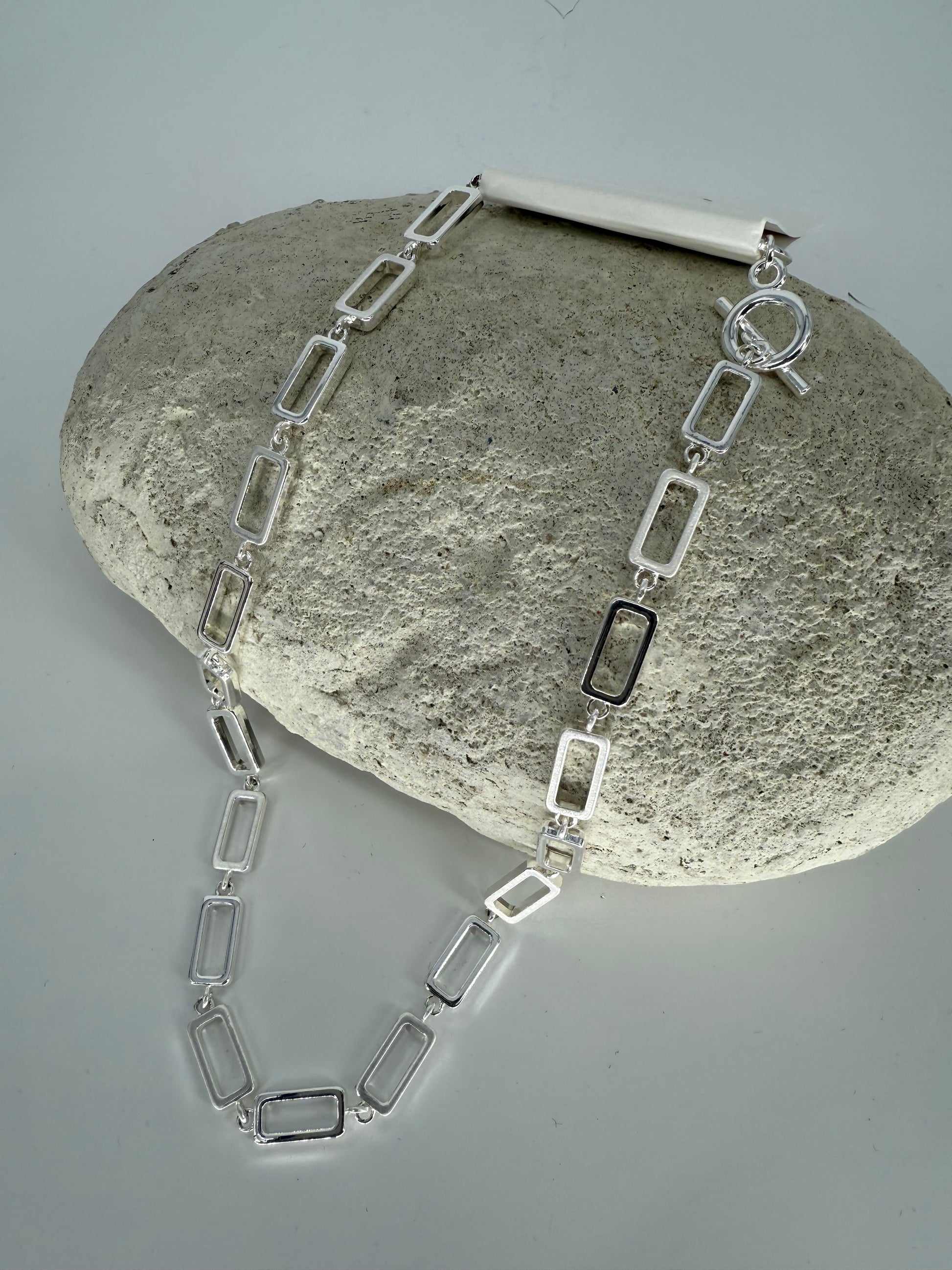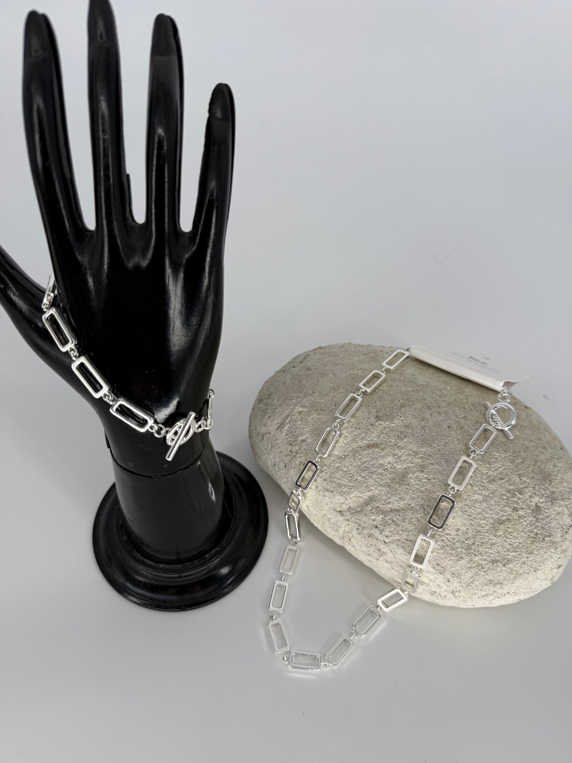 Trezo Silver Rectangle Link Necklace and Bracelet with Toggle Style Closure