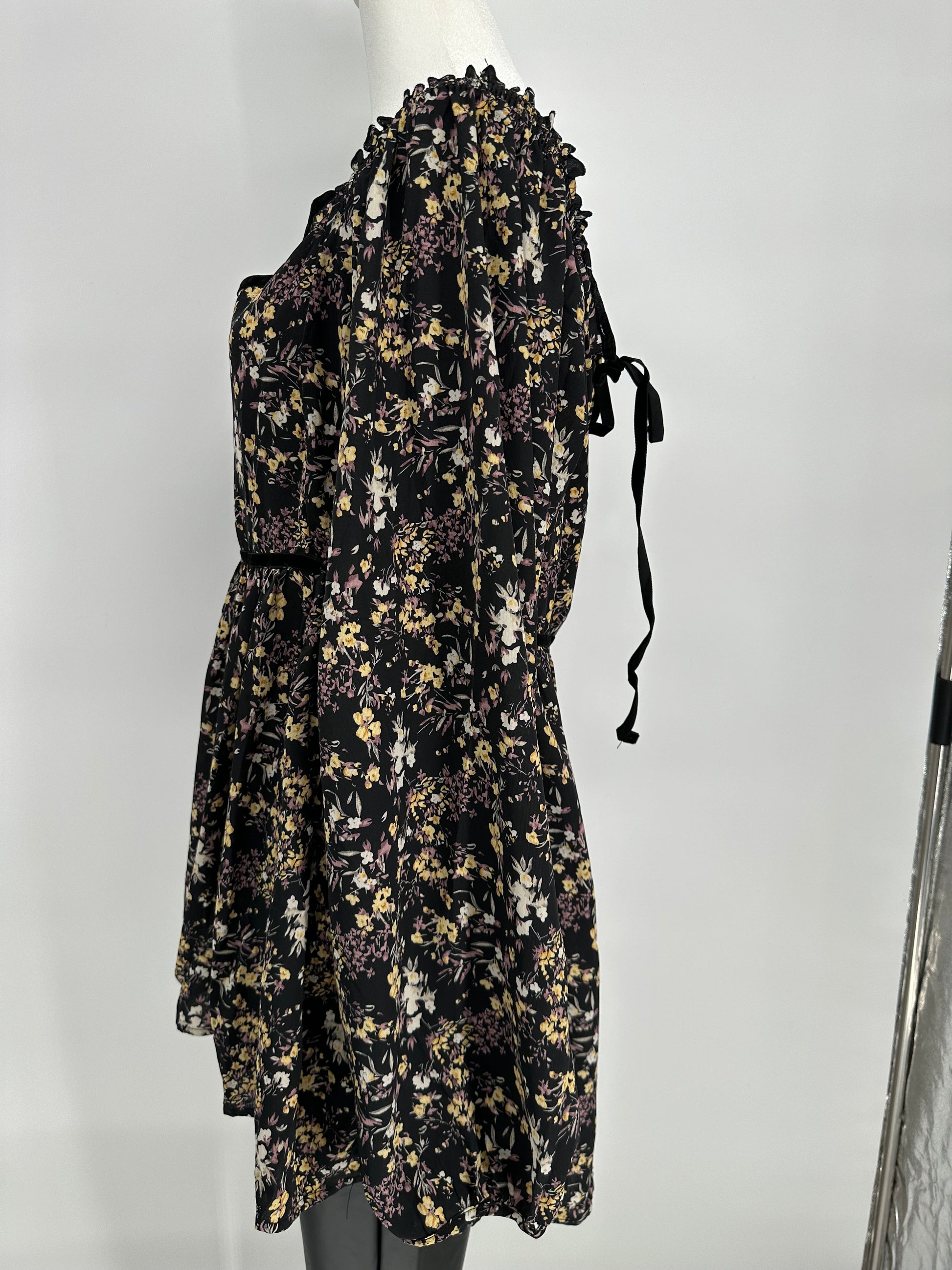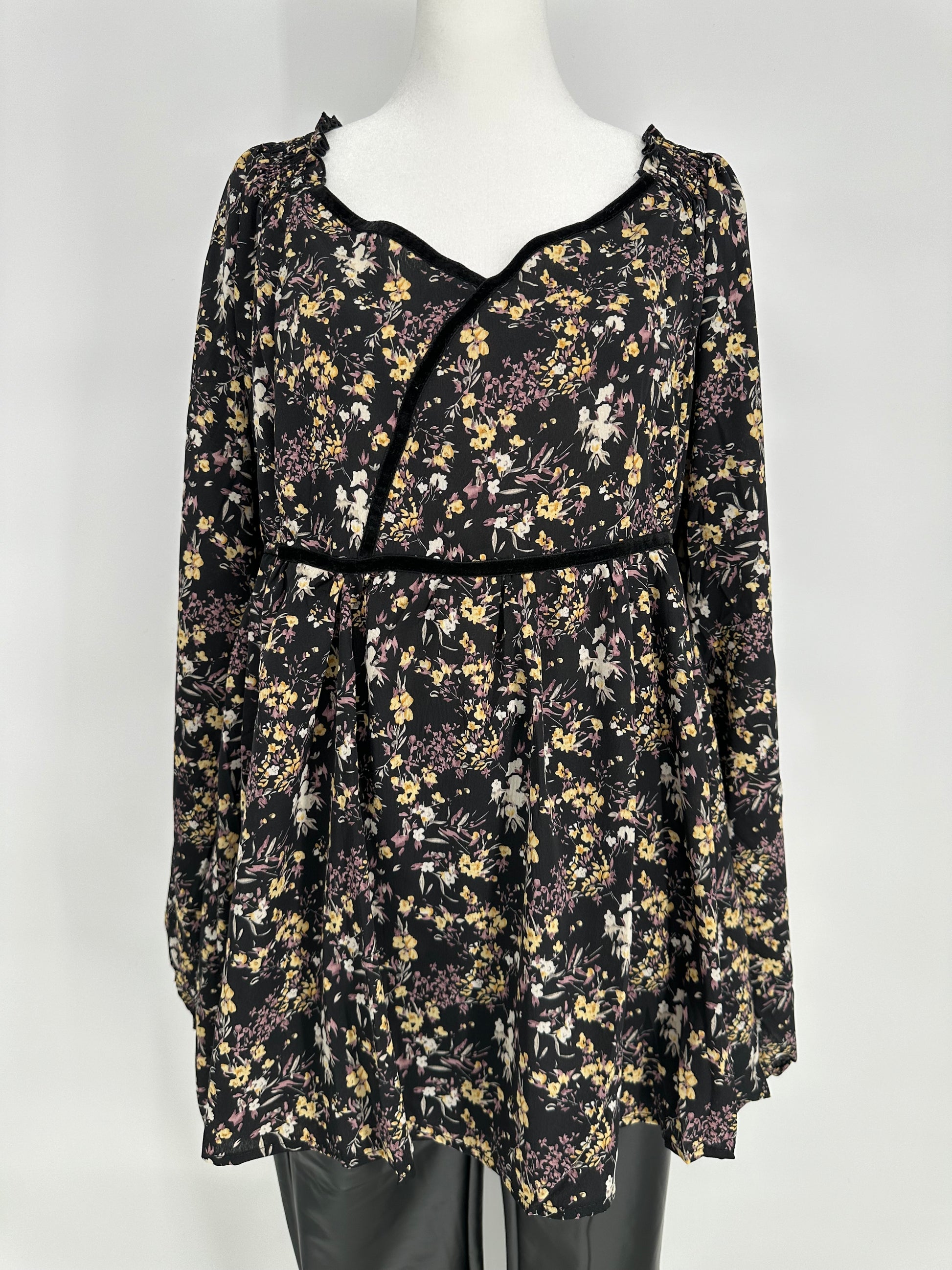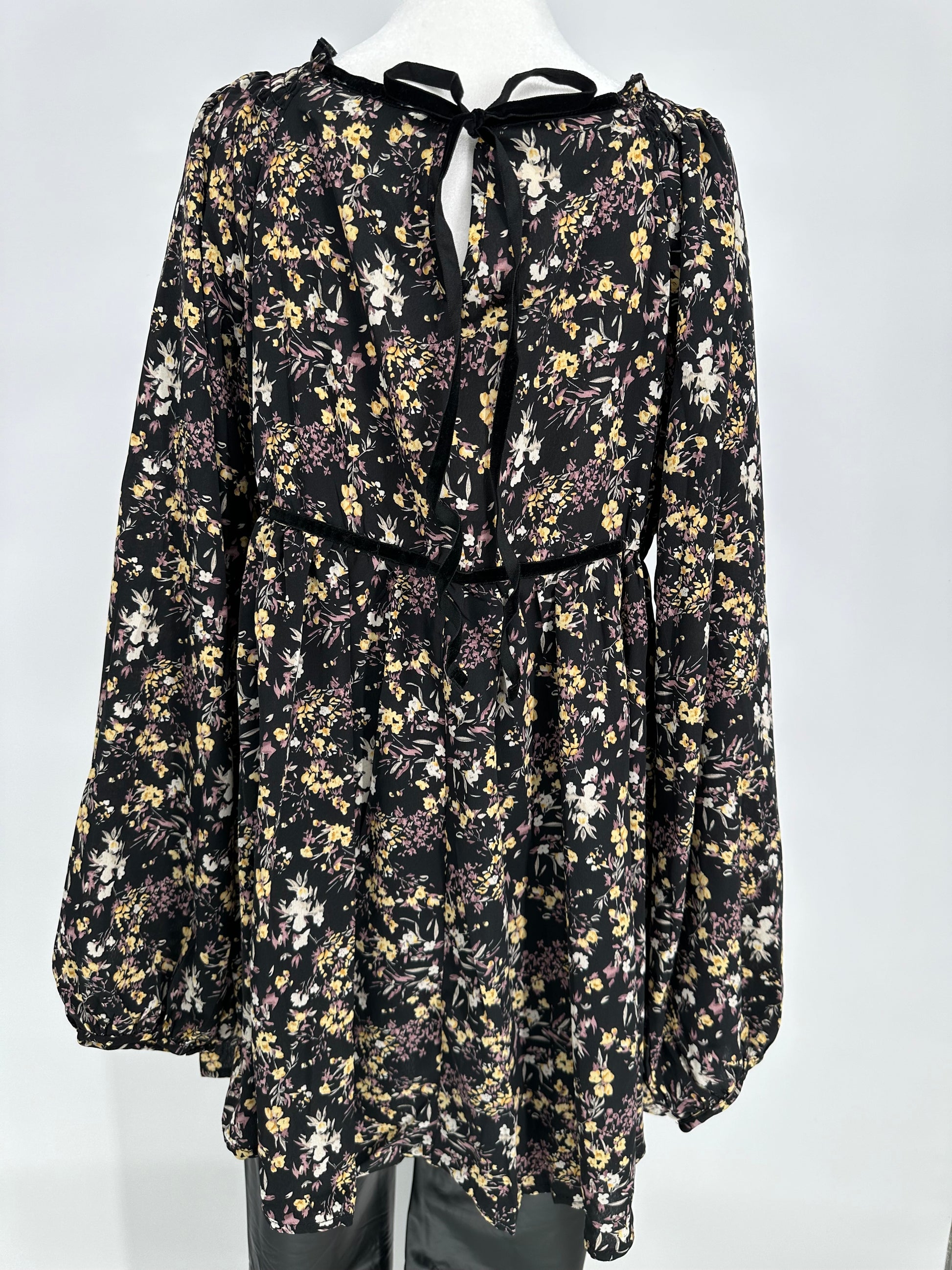 Lightweight fabric with dainty black velvet tie closure at the top of the neck. Very flattering lines, great design!