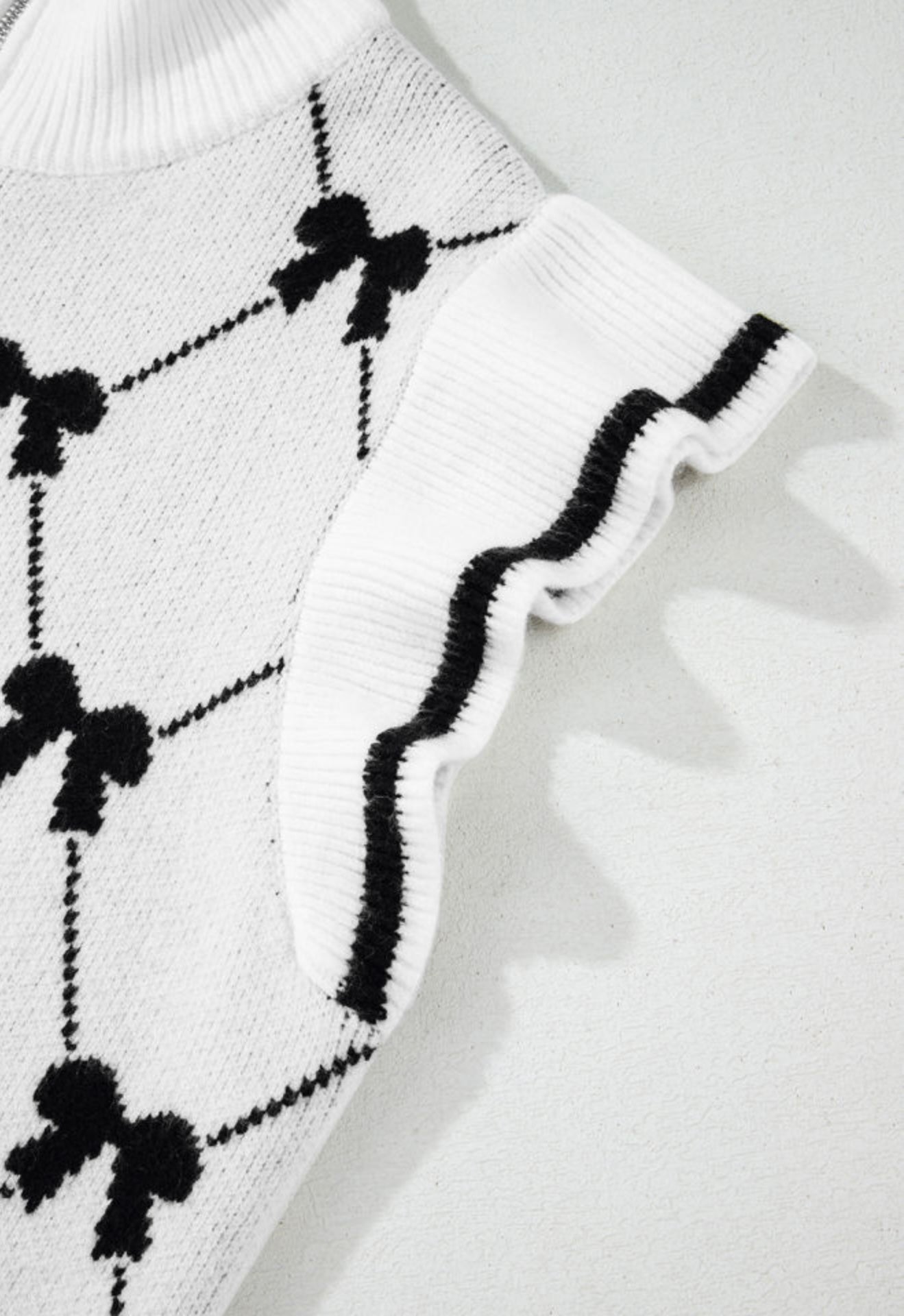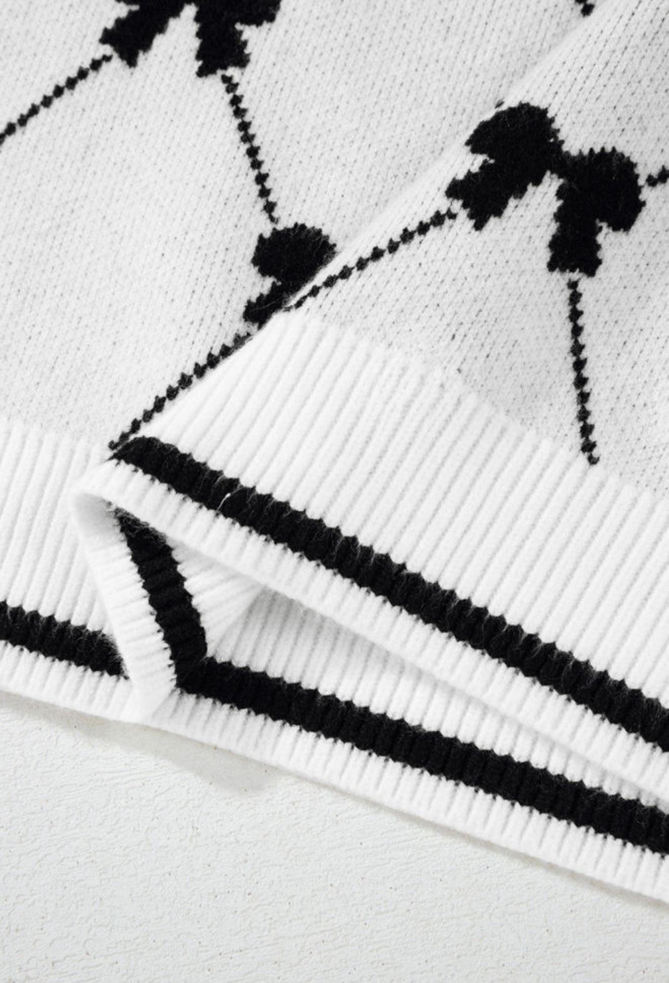 Stay cozy and stylish with this white zipper sweater featuring a charming black bow print. Its easy-to-wear design and classic color combination make it a versatile addition to your wardrobe, perfect for layering on cooler days or adding a playful touch to any outfit.